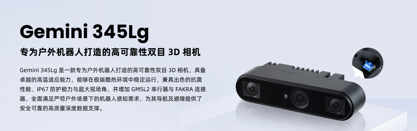 - 高性能双目3D相机,面向户外和大型机器人场景。